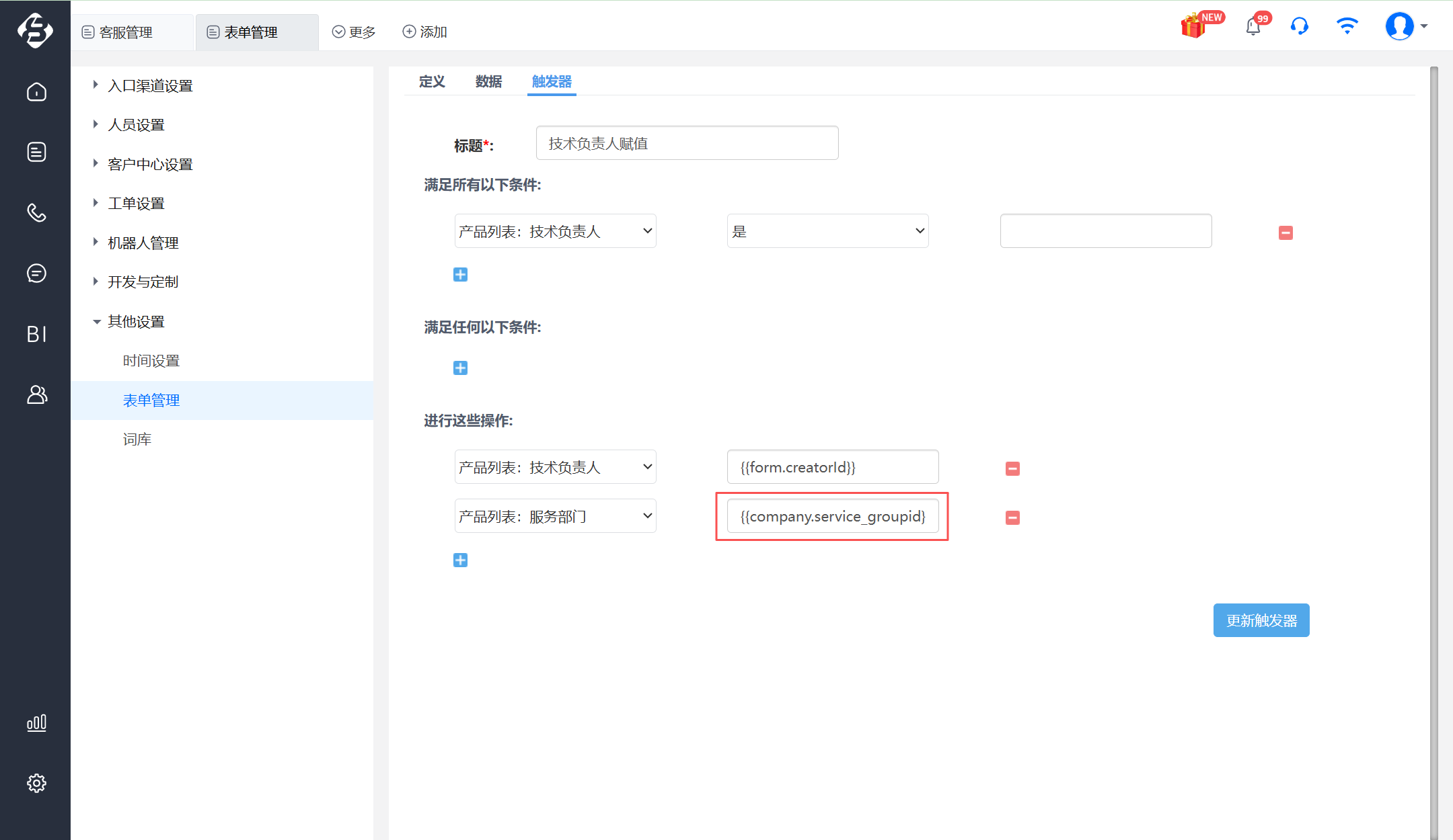 场景描述:表单触发器现在支持将当前客户(公司或联系人)所属的“受理客服组”自动填充到指定的文本字段中